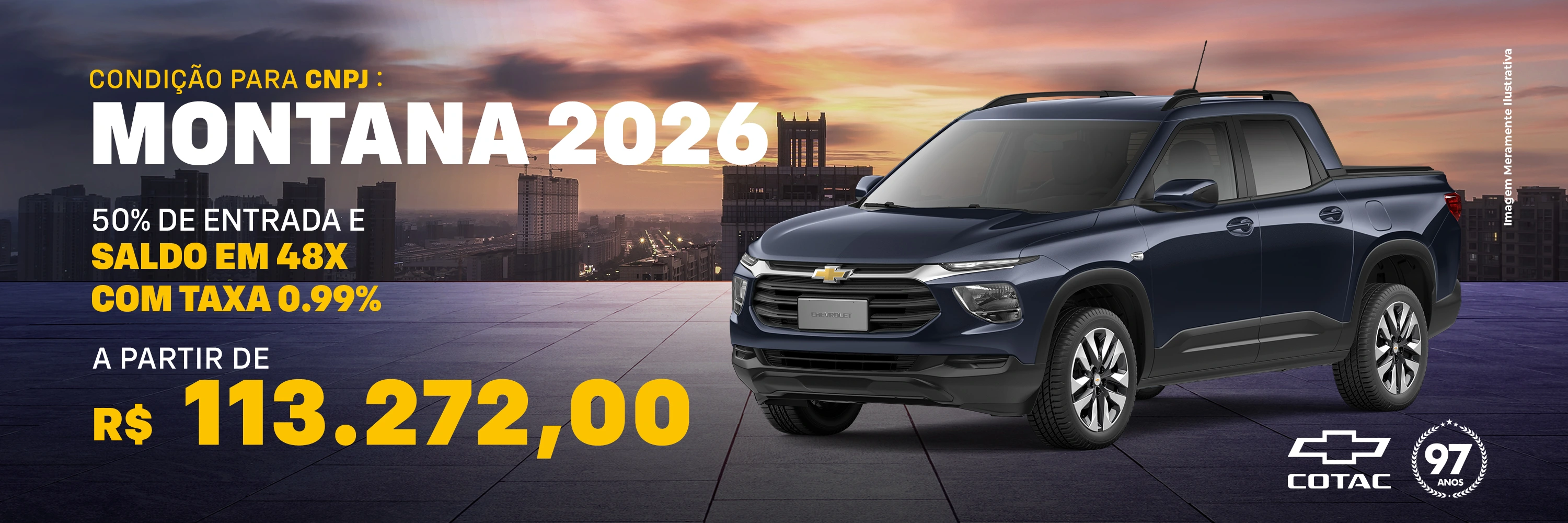O valor refere-se ao veículo Chevrolet Montana 1.2 Turbo – manual – Ano/Modelo 2025/2026 (conf. 5A43TT) , zero km, pacote RFA( pintura Vermelho Scarlet). Preço Público de R$ 141.590,00 desconto de R$ 28.318,00 (20%) e valor final de R$ 113.272,00. Valor para forma de pagamento: à vista ou financiamento sujeito aprovação.Desconto válido para faturamento até 30/09/2025 para modelos 2025. Condições válidas exclusivamente para veículos novos (0 km). Consulte veículos elegíveis aos descontos, validade dos descontos, planos de financiamento, condições e taxas diferenciadas diretamente na concessionária com o departamento de Vendas Diretas. Modalidade de Venda:Faturamento direto da fábrica. O desconto é exclusivo para empresas com CNPJ ativo na Receita Federal. Os descontos mencionados não são acumulativos com qualquer outro tipo de condi&c cedil;ão e/ ou promoção especial anunciados. As taxas podem variar de acordo com o perfil de crédito do cliente, sendo 50% de Entrada e saldo em 48x com Taxa especial de 0.99%, IOF e Taxa de abertura de credito serão acrescidos na operação.Sujeito à disponibilidade em estoque da fabricante. Imagem meramente ilustrativa. Reservamo-nos o direito de corrigir eventuais erros de imagem ou digitação.