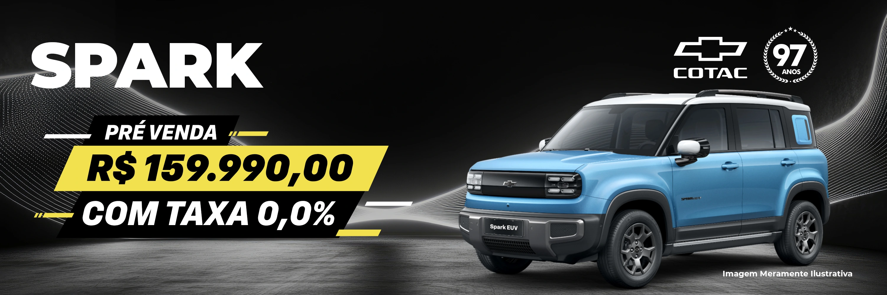 Taxa de Reserva no valor de R$ 5.000,00 referente a um veículo elétrico Chevrolet Spark EUV Activ (Conf. 1AAE3T), pacote PEA/PEB, ano/modelo 2025/2026 com promocional de pré-venda de R$ 159.990,00 nas cores Branco Cupuaçu e Preto Rio Negro e R$ 161.660,00 nas cores Azul Atlântico, Amarelo Canário, Cinza Redentor e Azul Anil ou através de plano de financiamento FDU com entrada 60% (R$ 96.996,00) e 24 prestações mensais e consecutivas de R$ 2.768,91 com taxa de juros a partir de 0% a.m. e CET de 2,67% a.a com total a prazo de R$ 163.449,84. Planos de financiamento direto ao usuário FDU sujeito à prévia análise de crédito e condições vigentes na data da compra. Restrições podem ser aplicadas conforme análise individual. Custo de IOF já incluso no cálculo das prestações. Tarifa de Confecção de Cadastro (TCC) no valor de R$ 950,00 e Taxas de Registro de Contrato, que variam de estado a estado, não estão inclusas no cálculo e poderão ser financiadas. Em caso de intenção pela contratação, o cliente será previamente informado sobre o Custo Efetivo Total onde constarão a taxa de juros pactuada, tributos incidentes na operação, tarifas eventualmente cobradas, seguros e serviços eventualmente contratados, além de outras despesas, de responsabilidade do cliente, que poderão ser cobradas. O Cliente deverá necessariamente concluir a compra com a Concessionária escolhida. O prazo de entrega pode variar em até 120 dias a partir da confirmação do pagamento da Taxa de Reserva. A reserva somente será efetivada após a confirmação do pagamento e apresentação dos documentos necessários e incluídos no sistema de Vendas (VD-WEB) da Chevrolet, o processo de inclusão do pedido no sistema é de responsabilidade da Concessionária escolhida. A reserva está sujeita a disponibilidade do veículo no ato da inclusão do pedido no sistema, a solicitação da reserva por meio do site não garante a reserva e/ou a compra. Após a confirmação de chegada do veículo pela Concessionária, o pagamento do restante do valor deverá ser realizado em até 15 dias úteis (seja pela forma de pagamento de escolha do comprador) sob pena da reserva ser automaticamente cancelada. Caso haja desistência da reserva, a devolução do valor pago será realizada via estorno somente e exclusivamente para o mesmo CPF/CNPJ que efetuou o pagamento do sinal. Para mais informações, consulte um Concessionário Chevrolet. Oferta válida até a finalização do lote especial e apenas nas concessionárias credenciadas em veículos elétricos do Brasil. Oferta não válida ou cumulativa com modalidade de venda direta da fábrica, taxistas e produtores rurais. Os veículos Chevrolet estão em conformidade com o PROCONVE – Programa de Controle da Poluição do Ar por Veículos Automotores. Para mais informações, consulte um Concessionário Chevrolet ou visite Fique por dentro dos lançamentos através do site oficial da Chevrolet Brasil https://www.chevrolet.com.br – SAC Chevrolet: 0800 702 4200 e SAC Chevrolet Serviços Financeiros – [Início | Chevrolet Serviços Financeiros, Central de Relacionamento: 0800 728 0613, disponível de segunda a sexta-feira, das 8h às 20h. Atendimento Eletrônico 24h | SAC: 0800 721 5394 | Deficientes Auditivos: 0800 727 0640 | Ouvidoria: 0800 722 6022. Os preços podem variar de acordo com o seu Estado. Solicite sua proposta em uma das nossas Concessionárias Chevrolet. Perceba o risco, proteja a vida.