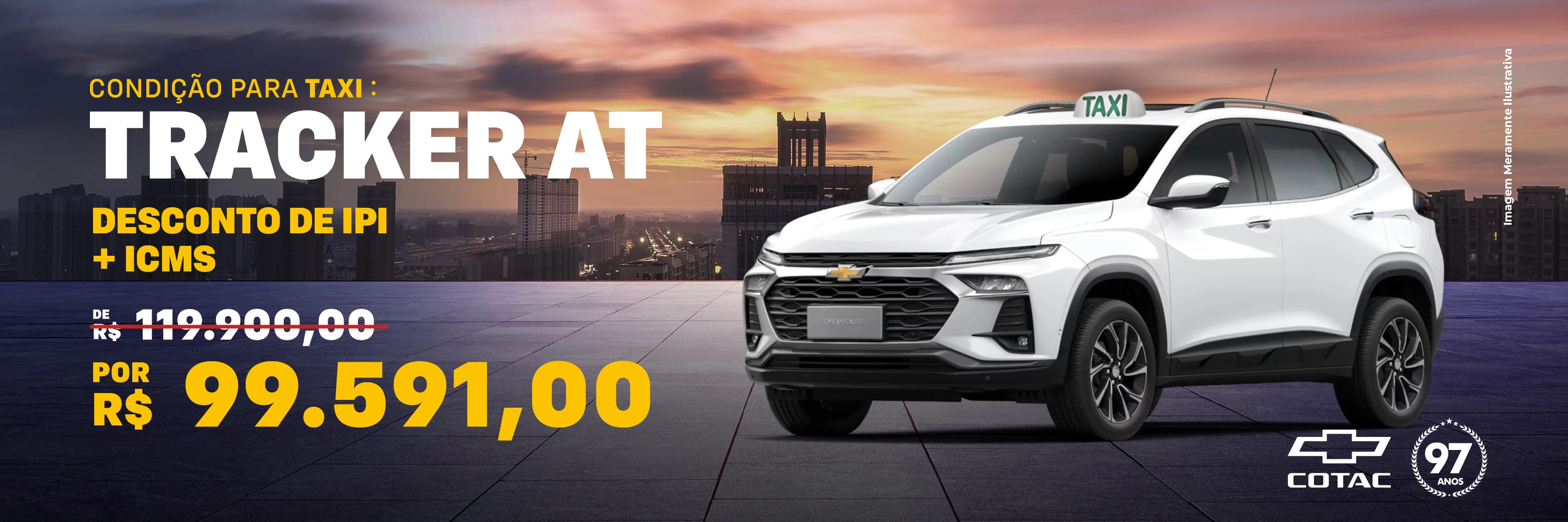 O valor refere-se ao veículo Chevrolet Tracker AT – 1.0 Turbo – Ano/Modelo 2025/2026 (conf. 5X76DS) , zero km, pintura Azul Boreal, pacote R8B, demais cores com acréscimo conforme tabela vigente. Preço Público de R$ 119.990,00 desconto de R$ 20.399 (isenção de ICMS parcial e isenção de IPI concedida pelo Governo), e valor final de R$ 99.591,00. Os valores acima anunciados foram calculados para venda direta a clientes Taxistas com isenção de ICMS e isenção de IPI com base na tabela de preço público vigente em Setembro/25, que está sujeita a alterações a qualquer momento, sem aviso prévio. Sujeito à disponibilidade em estoque da fabricante. Imagem meramente ilustrativa. Reservamo-nos o direito de corrigir eventuais erros de imagem ou digitação.