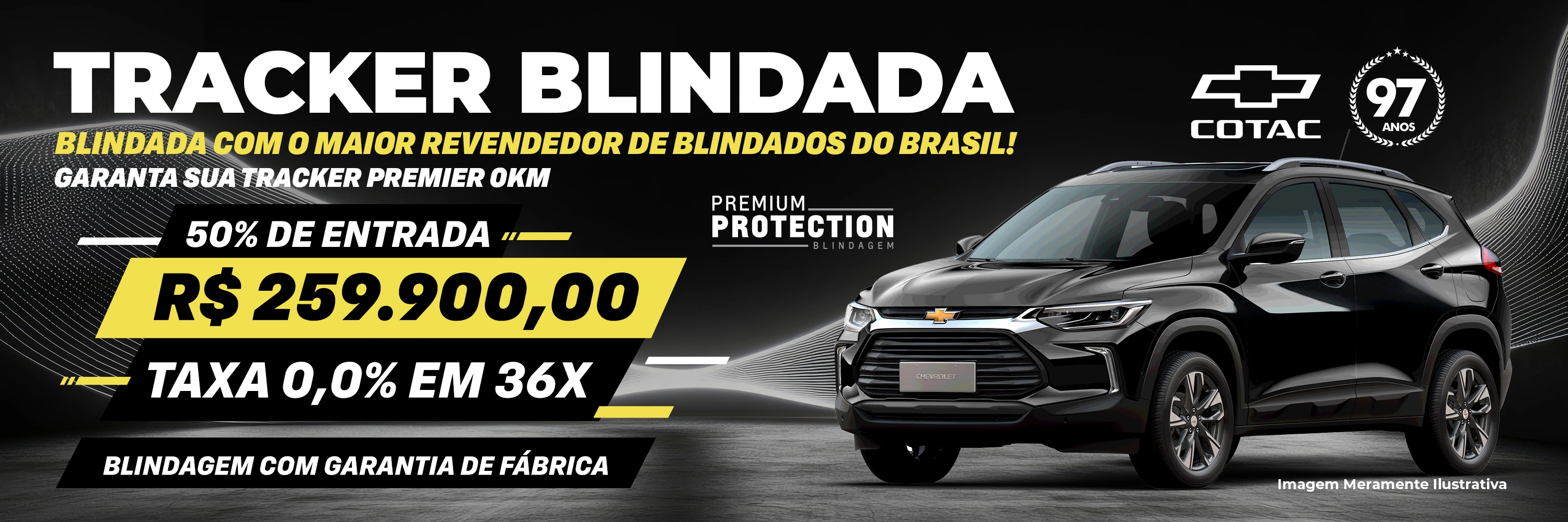 Tracker Premier (Conf. 5P76BS ou 3P76BS), pacote RFG ano/modelo 2025/2025 pintura na cor Azul Boreal, com preço promocional à vista a partir de R$ 160.280,00, ou através de plano de financiamento FDU com entrada de 50,15% (R$ 80.870,00) e 36 prestações mensais e consecutivas de R$ 2.299,67, com taxa de juros a partir de 0% a.m. e CET de 2,76% a.a. Valor total a prazo de R$ 163.658,12. Plano de financiamento direto ao usuário FDU sujeito à prévia análise de crédito e condições vigentes na data da compra. Restrições podem ser aplicadas conforme análise individual. Custo de IOF já incluso no cálculo das prestações. Tarifa de Confecção de Cadastro (TCC) no valor de R$ 970,00 e Taxas de Registro de Contrato, que variam de estado a estado, não estão inclusas no cálculo e poderão ser financiadas. Em caso de intenção pela contratação, o cliente será previamente informado sobre o Custo Efetivo Total onde constarão a taxa de juros pactuada, tributos incidentes na operação, tarifas eventualmente cobradas, seguros e serviços eventualmente contratados, além de outras despesas, de responsabilidade do cliente, que poderão ser cobradas. Oferta válida até 31/08/2025 nas concessionárias participantes e apenas para veículos Chevrolet 0 km no estoque da Rede. Oferta não válida ou cumulativa com modalidade de venda direta da fábrica, taxistas e produtores rurais. Os veículos Chevrolet estão em conformidade com o PROCONVE – Programa de Controle da Poluição do Ar por Veículos Automotores. Para mais informações, consulte um Concessionário Chevrolet ou visite www.chevrolet.com.br <http://www.chevrolet.com.br> – SAC Chevrolet: 0800 702 4200 e SAC Chevrolet Serviços Financeiros – www.chevroletsf.com.br <http://www.chevroletsf.com.br> , Central de Relacionamento: 0800 728 0613, disponível de segunda a sexta-feira, das 8h às 20h. Atendimento Eletrônico 24h | SAC: 0800 721 5394 | Deficientes Auditivos: 0800 727 0640 | Ouvidoria: 0800 722 6022. Os preços podem variar de acordo com o seu Estado. Solicite sua proposta em uma das nossas Concessionárias Chevrolet. Desacelere. Seu maior bem é a vida.