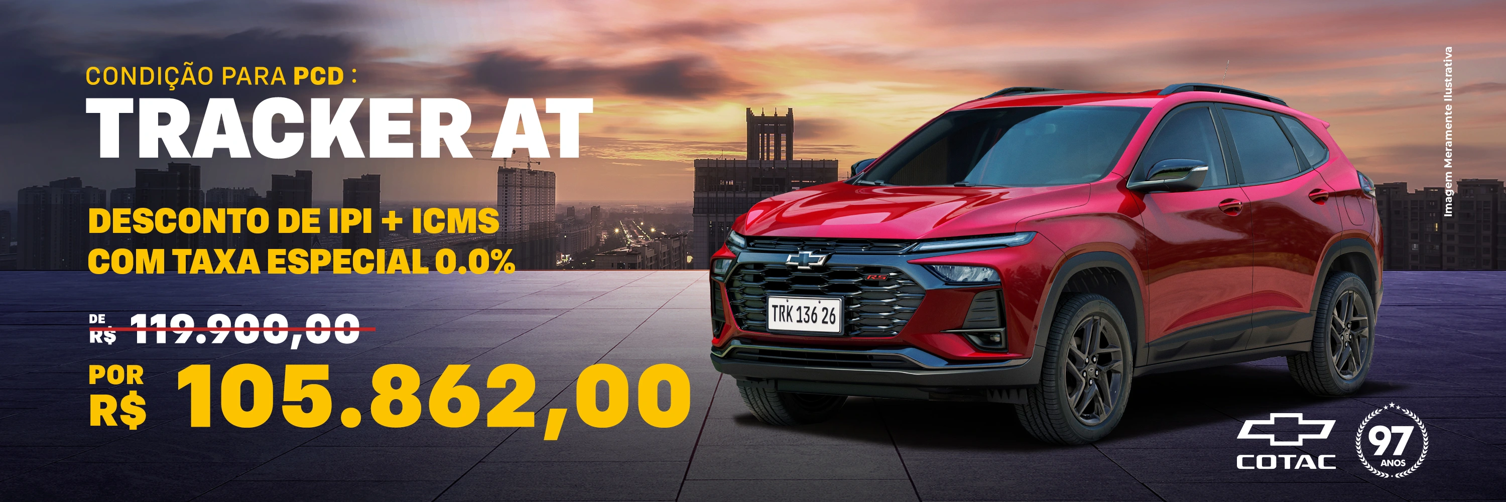 O valor refere-se ao veículo Chevrolet Tracker AT Turbo – Ano/Modelo 2025/2026 (conf. 5X76DS) , zero km, pacote R8B. Preço Público de R$ 119.990,00 desconto de R$ 14.128,00 (isenção de ICMS parcial e isenção de IPI concedida pelo Governo E Bônus de fábrica), e valor final de R$ 105.862,00. Valor para forma de pagamento: à vista ou financiamento sujeito aprovação.Desconto válido para faturamento até 30/09/2025. Condições válidas exclusivamente para veículos novos (0 km).